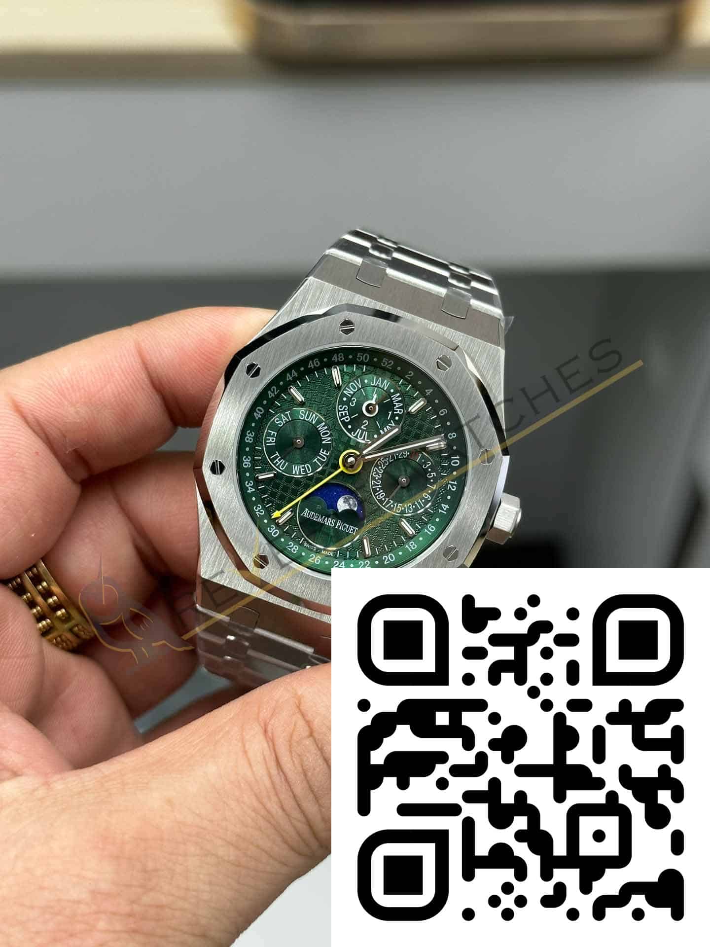 The best Audemars Piguet Royal Oak Perpetual Calendar Green Dial Replica super clone on the market with worldwide shipping and a 2 year Reverie Watches warranty.