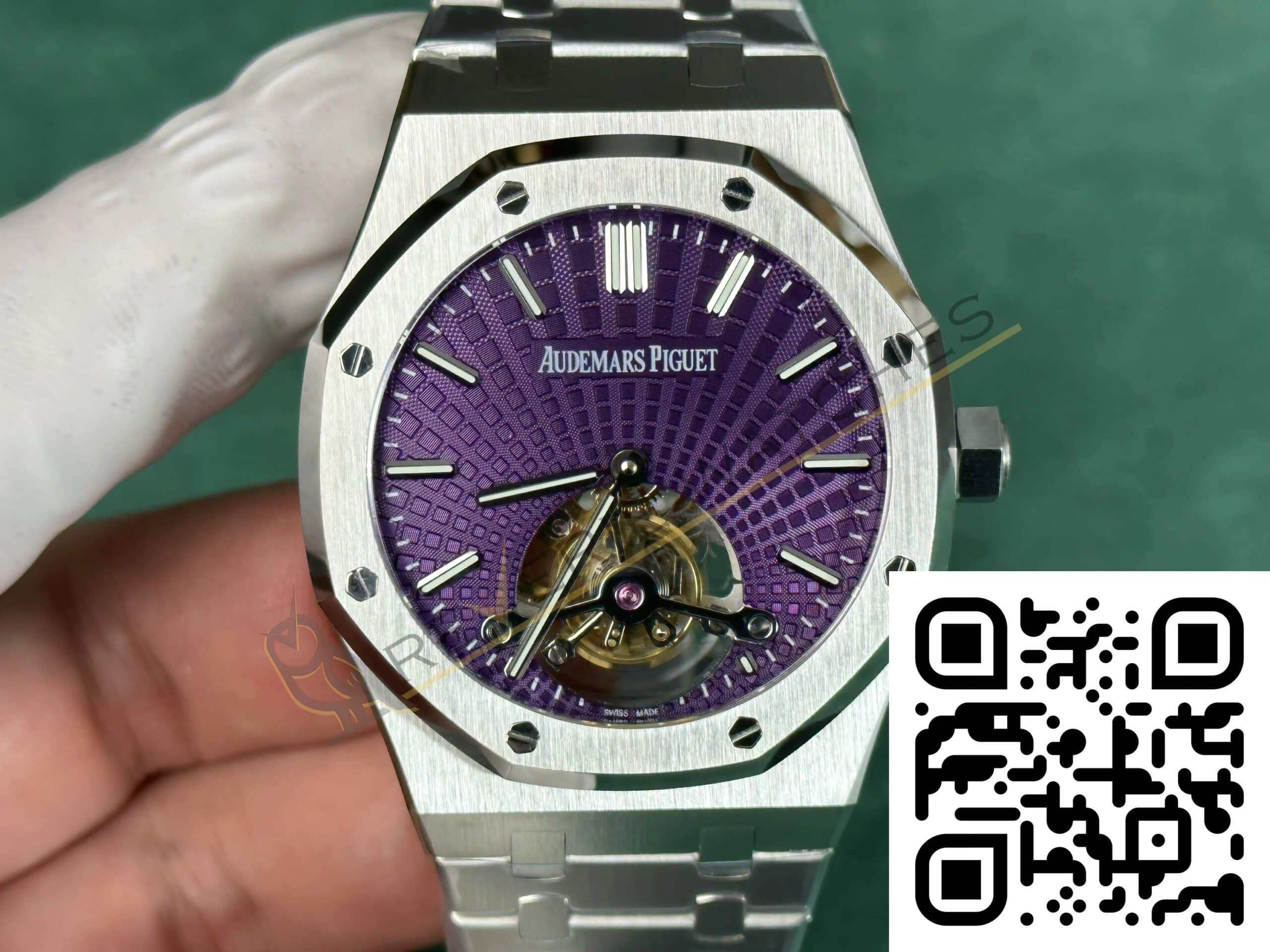 The best Audemars Piguet Royal Oak Tourbillion Purple Dial Replica super clone on the market with worldwide shipping and a 2 year Reverie Watches warranty.