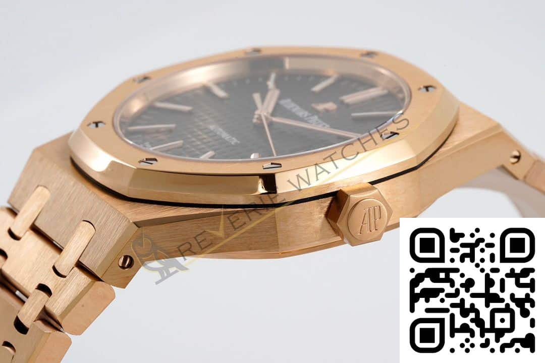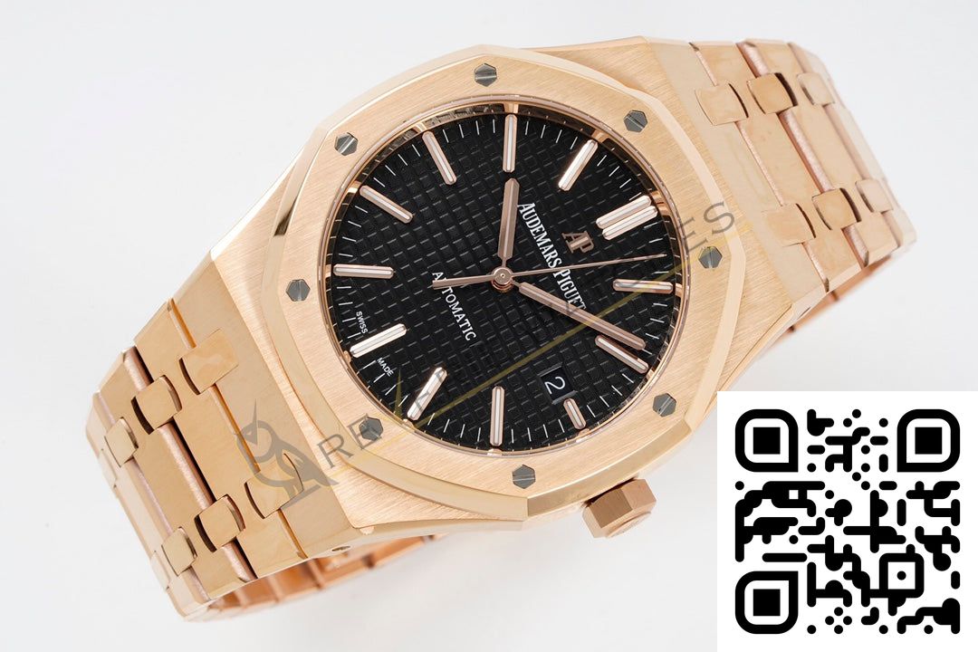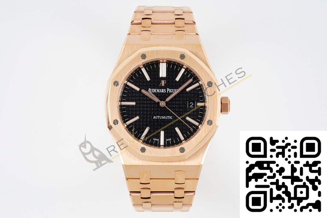 The best Audemars Piguet Royal Oak Rose Gold Black Dial Replica super clone on the market with worldwide shipping and a 2 year Reverie Watches warranty.