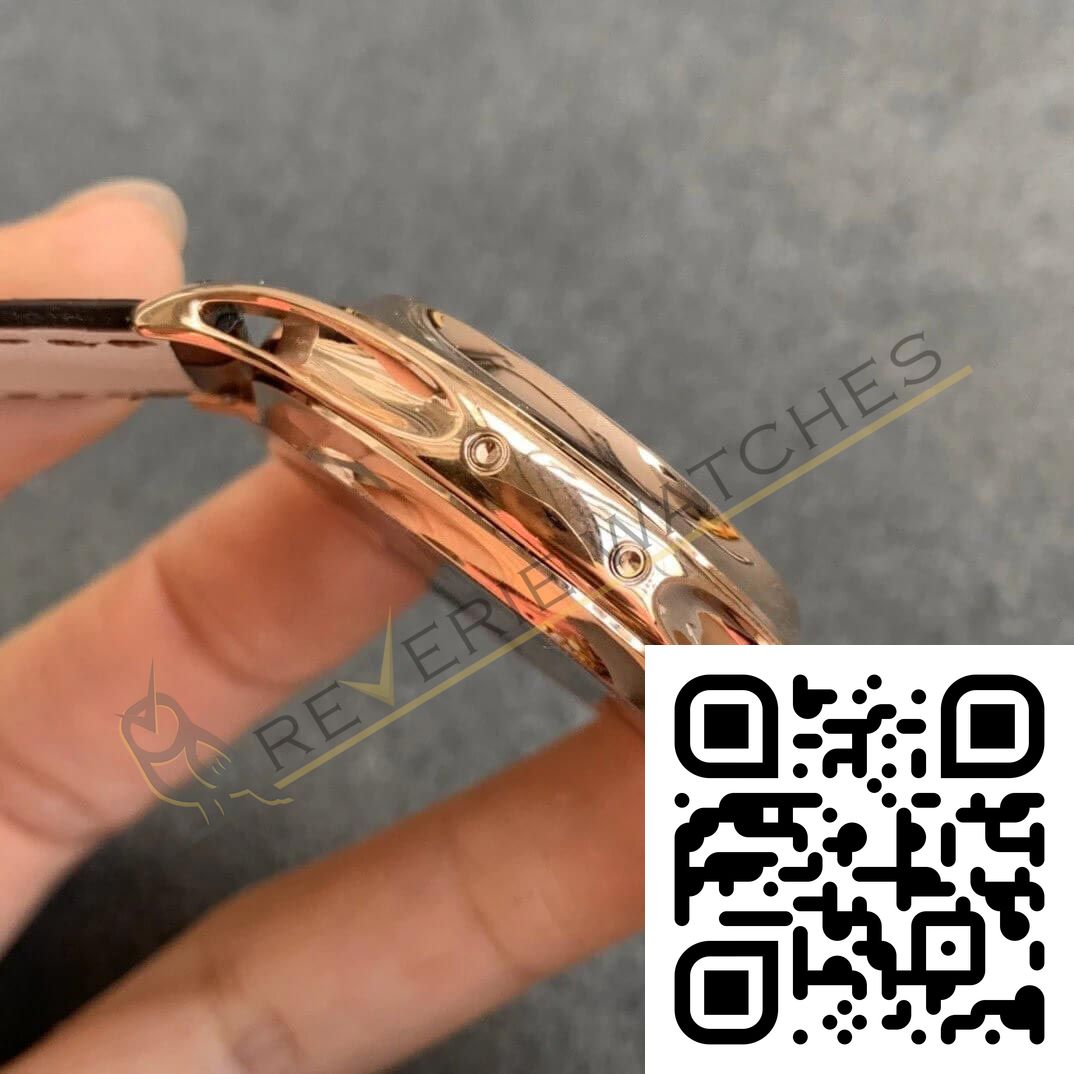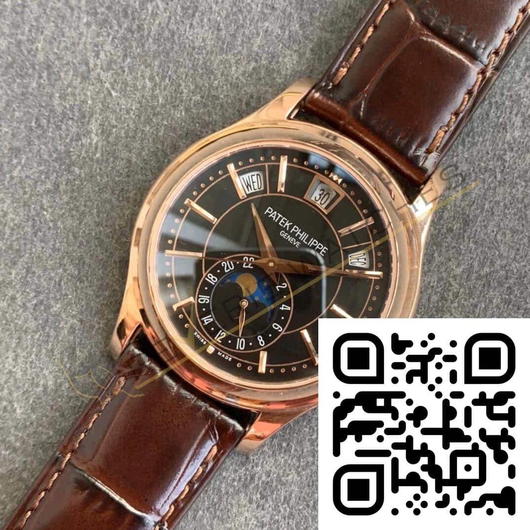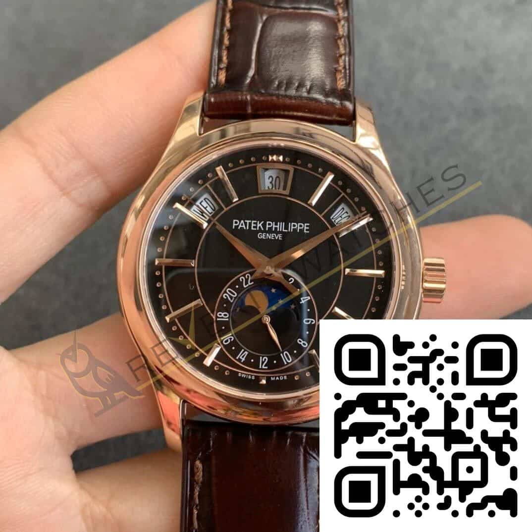 The best Patek Philippe Complications 5205 Rose Gold Black Dial Replica super clone on the market with worldwide shipping and a 2 year Reverie Watches warranty.