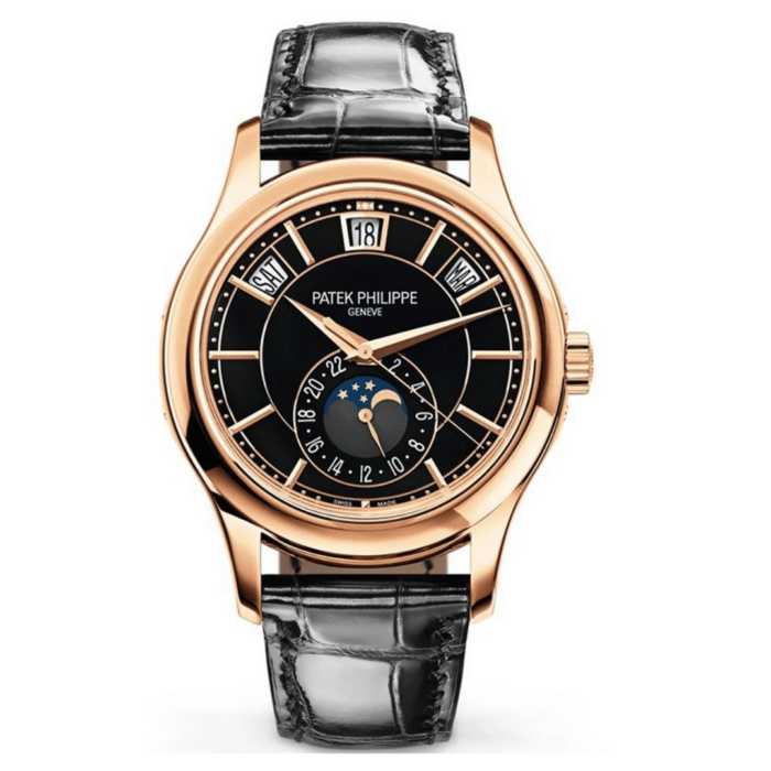 The best Patek Philippe Complications 5205 Rose Gold Black Dial Replica super clone on the market with worldwide shipping and a 2 year Reverie Watches warranty.