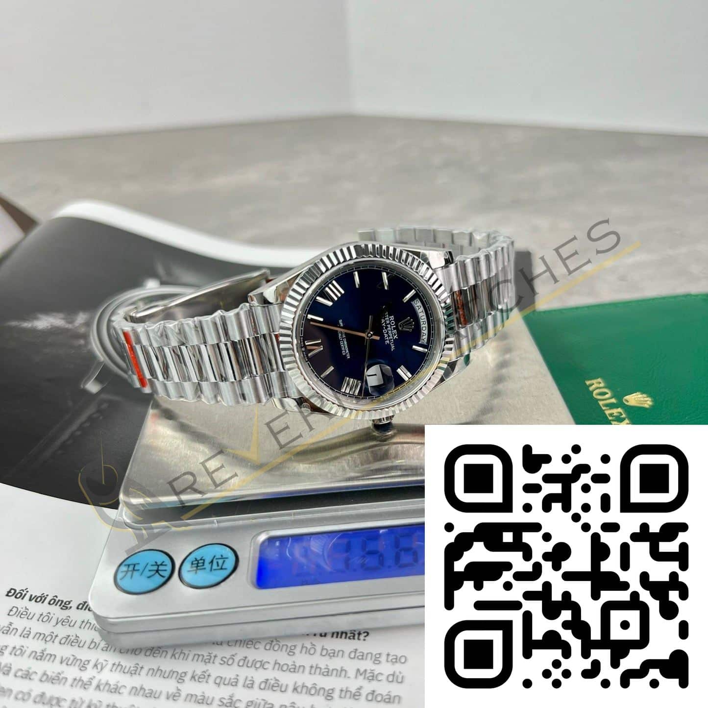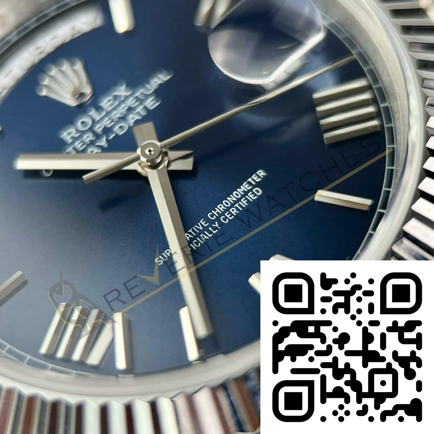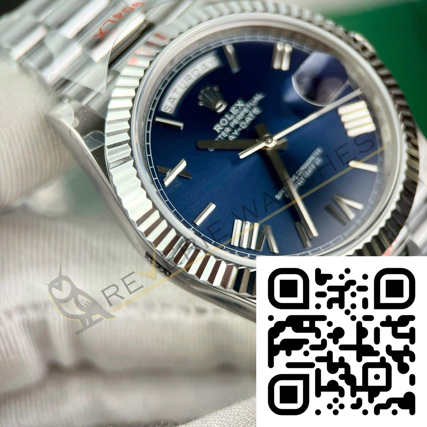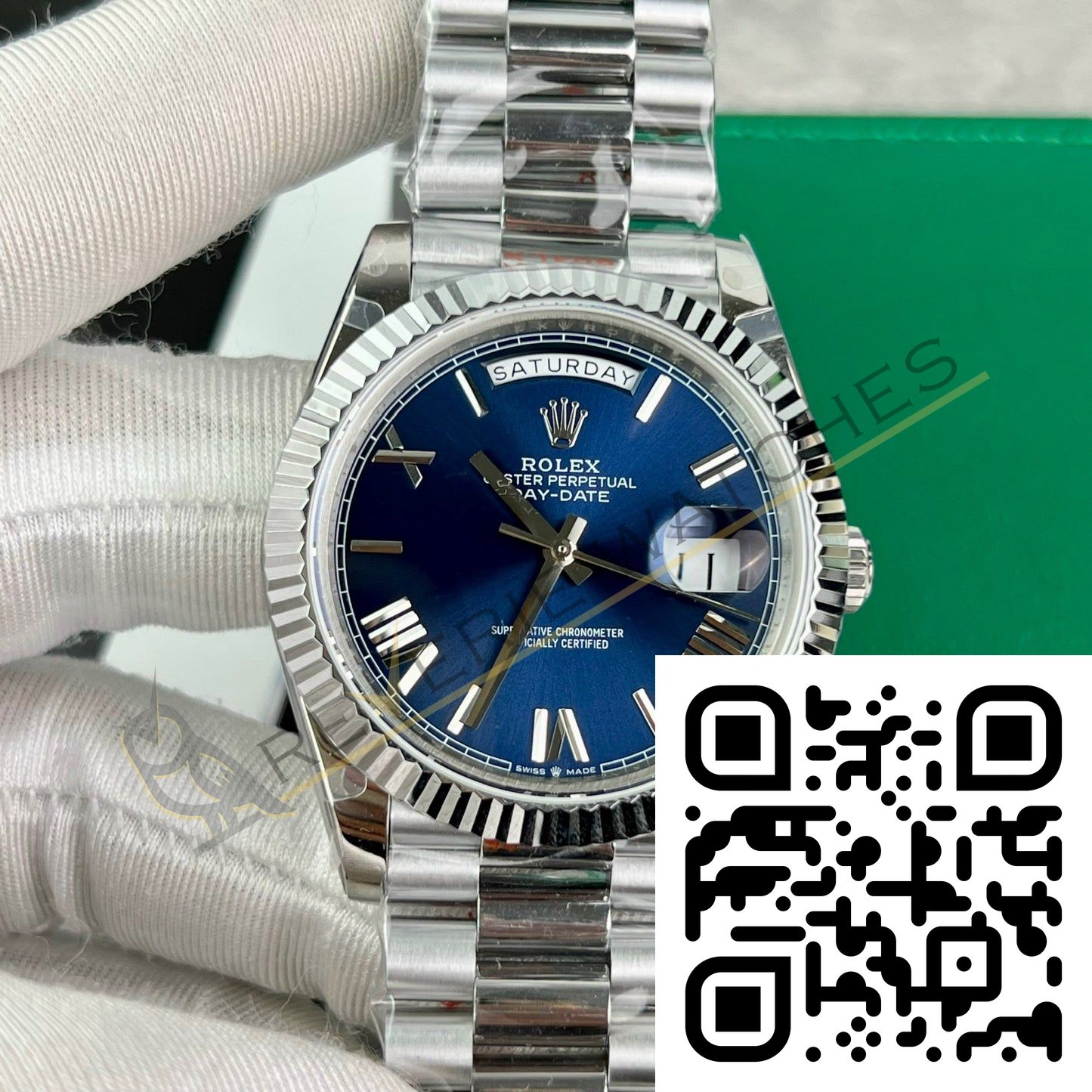 The best Rolex Day-Date 40 Blue Roman Dial Replica super clone on the market with worldwide shipping and a 2 year Reverie Watches warranty.
