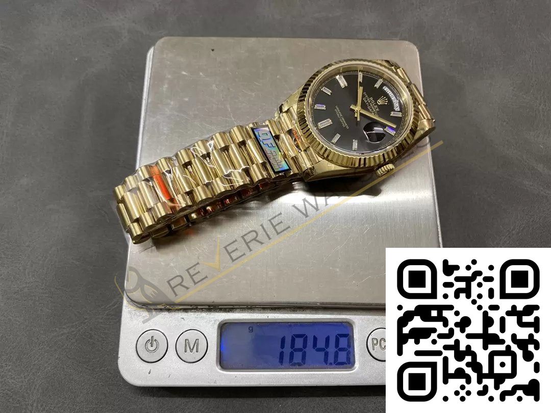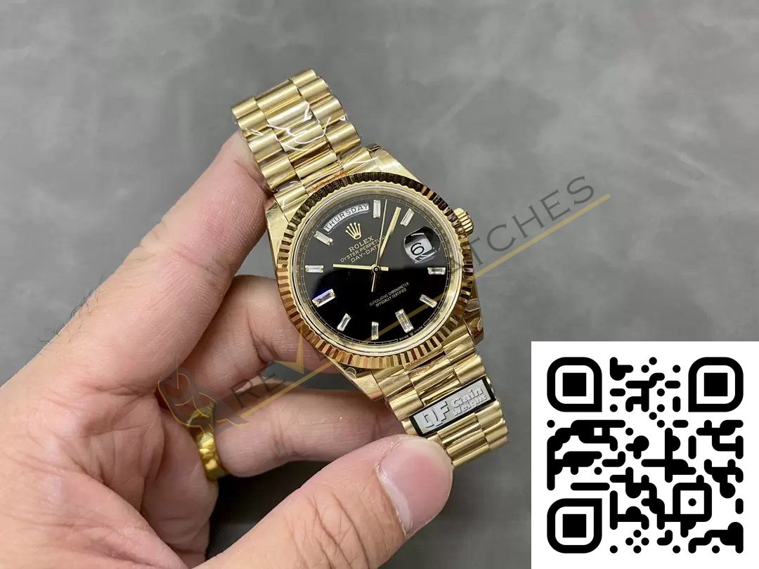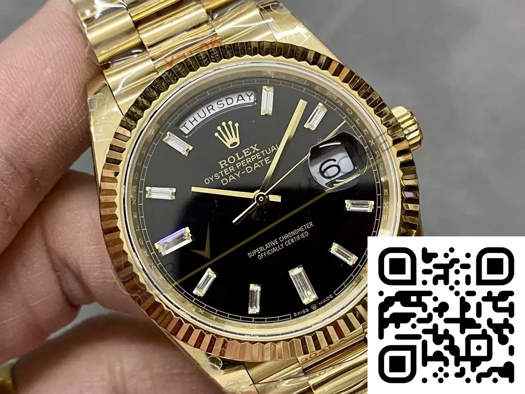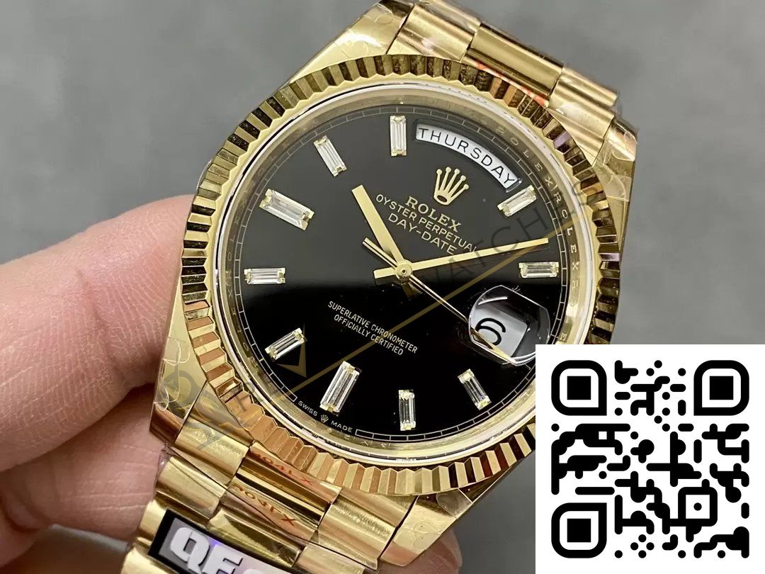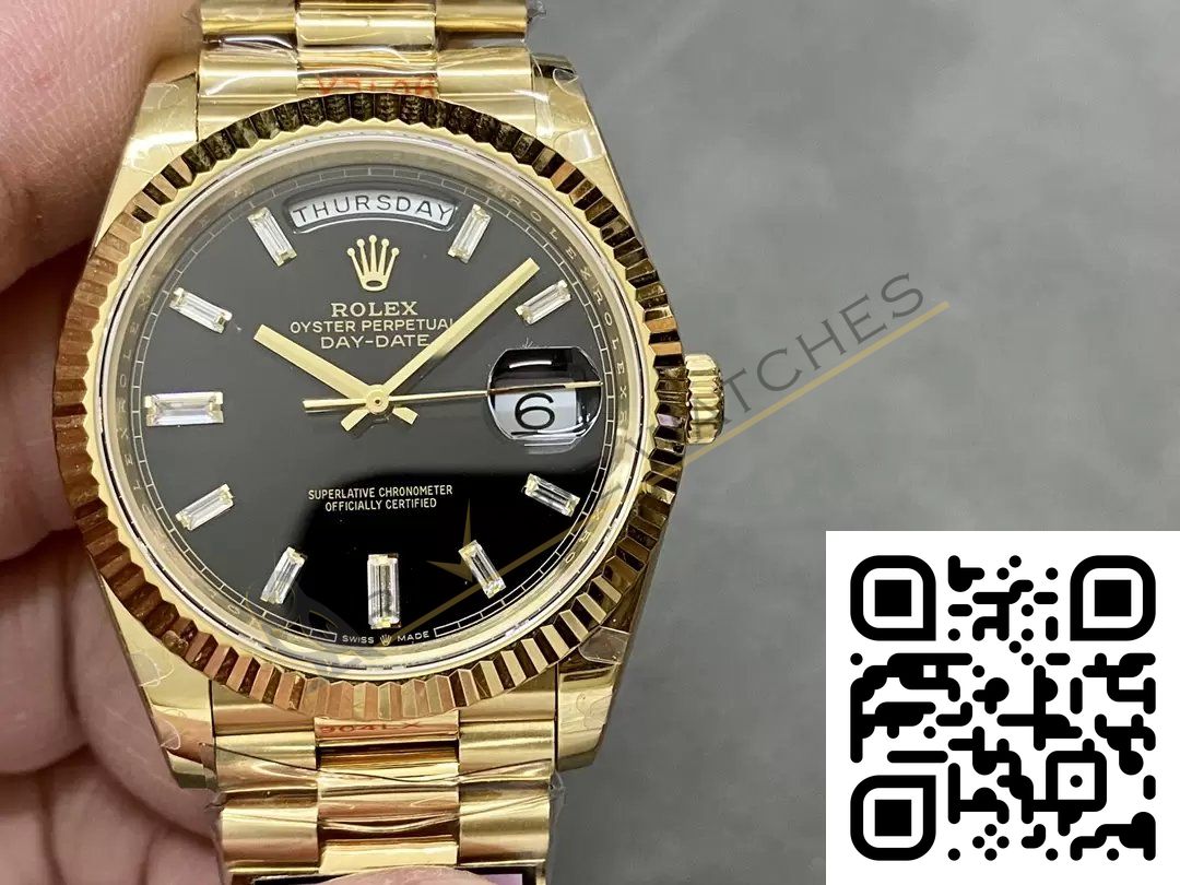 The best Rolex Day-Date Yellow Gold Black Diamond Dial Replica super clone on the market with worldwide shipping and a 2 year Reverie Watches warranty.